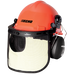 The helmet is designed with a six-point ratching system on the headpiece to adjust for different head sizes, while the interior cushion pad provides comfortability for the wearer during use. The bright orange color is for high visibility in any condition. The helmet includes a mesh face visor and ear protection that has been NRR rated at 22 dB(A).